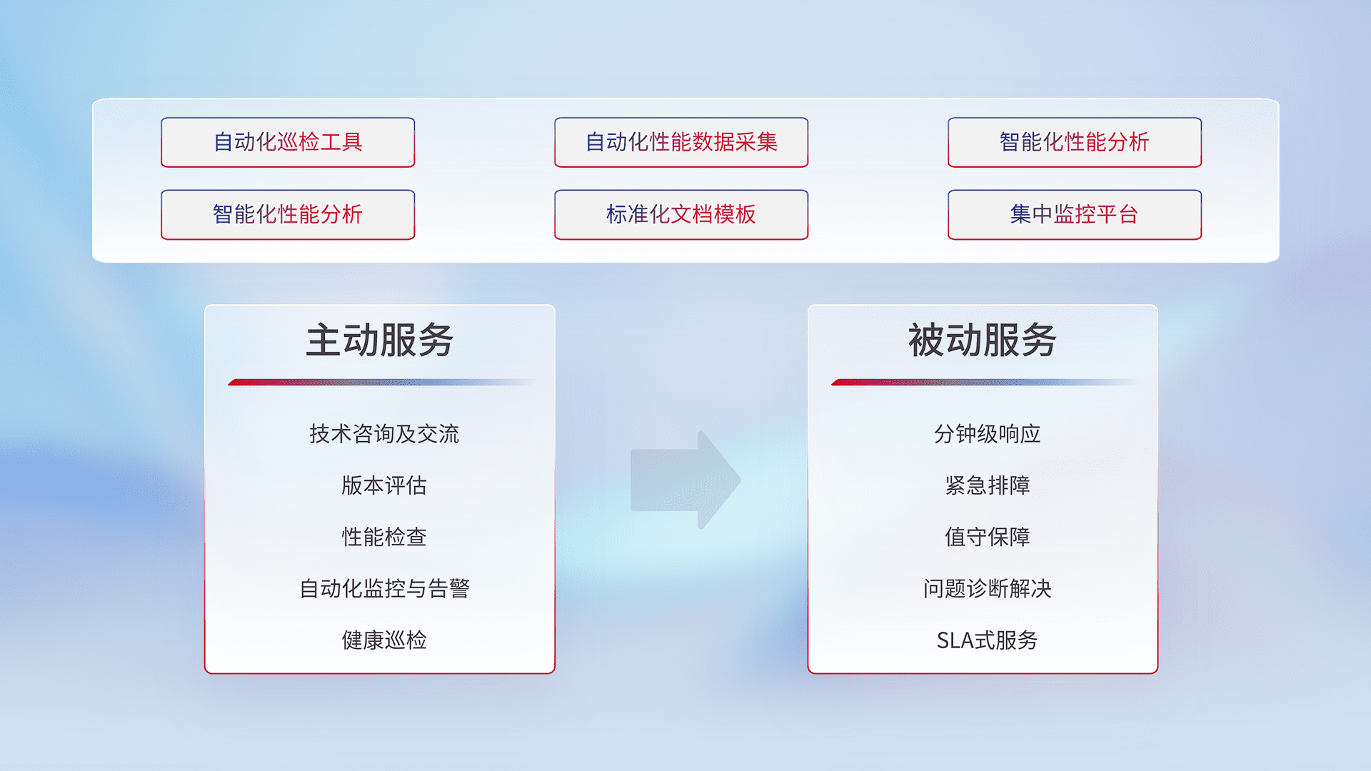 智能化工具和标准化文档,,保障服务质量,,,,提供主动服务(包含技术咨询、、、版本评估、、、、性能检查、、自动化监控与告警、、、健康巡检)和被动服务包含(分钟级响应、、紧急排障、、、、值守保障、、、、问题诊断解决、、SLA服务)。。。