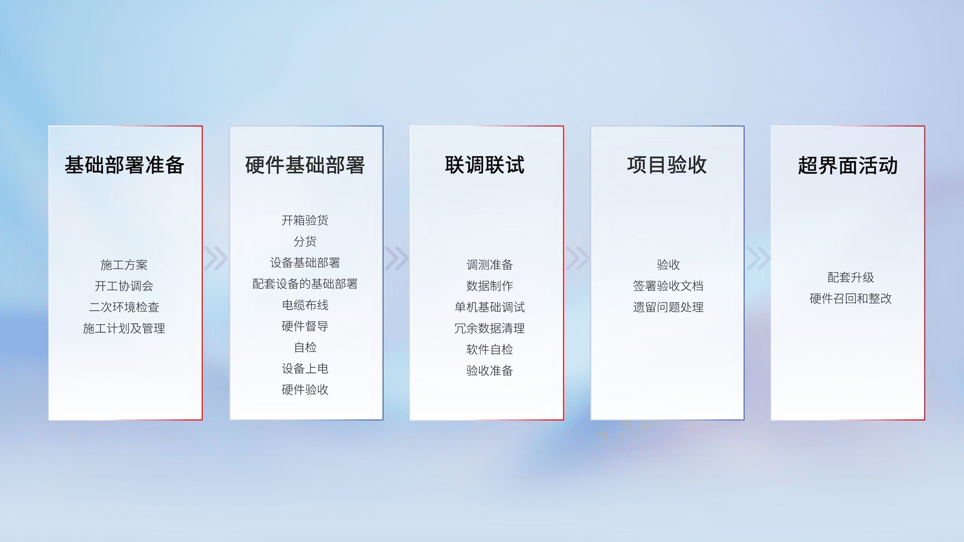 从基础部署准备、、硬件基础部署、、、联调联试、、、项目验收、、越界面活动的全过程可追溯,,,保证施工质量和进度。。。。